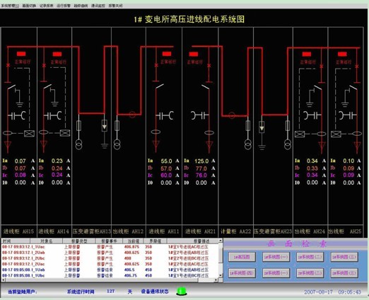 標(biāo)準(zhǔn)的變配電系統(tǒng)具有CAD一次單線圖顯示中、低壓配電網(wǎng)絡(luò)的接線情況;龐大的系統(tǒng)具有多畫面切換及畫面導(dǎo)航的功能;分散的配電系統(tǒng)具有空間地理平面的系統(tǒng)主畫面。主畫面可直觀顯示各回路的運(yùn)行狀態(tài),并具有回路帶電、非帶電及故障著色的功能。主要電參量直接顯示于人機(jī)交互界面并實(shí)時(shí)刷新。