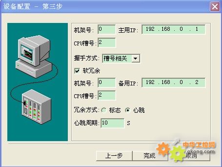圖2中,冗余系統由A和B兩套PLC控制系統組成,初始狀態,A系統為主站,B系統備用站,當主系統A中的任何一個組件出現故障時,控制任務會自動切換到備用系統B中執行。這時,B系統為主站,A系統為備用站,系統運行過程中,即使沒有任何組件出錯,操作人員也可以通過設定控制字,實現手動的主備系統切換。 當主備系統切換時,為了保證上位機的正常切換,則在力控軟件需要進行相應的配置。冗余切換實現方式有兩種:標志和心跳(如圖3所示),需要配合的PLC的程序的使用。首先在PLC的程序中做一個標志字(心跳字),然后在力控數據庫組態中組態一個對應的點連接即可。