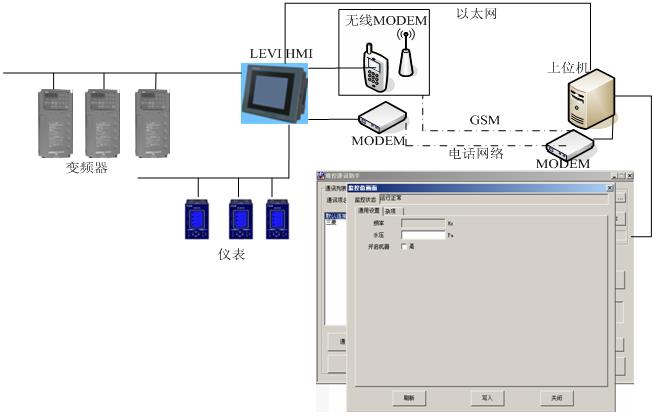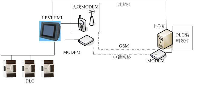 在該架構中,LEVI HMI處于所有設備的中間,主要起到一個橋接的作用。通過電話、GSM、以太網等網絡形式,上位機可以隨時與遠程的PLC、變頻器、儀表等設備進行通信、調試,效果和在本地調試一樣。這樣有效的減少了維護成本與時間。