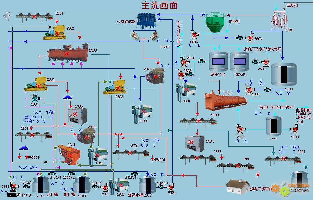⑴ 第一級:管理信息網絡 主要掛接管理站、管理服務器和視頻服務器,并負責與企業外部的接口。 ⑵ 第二級:監控信息網絡 包括兩層: ●遠程I/O網絡級:集控系統的CPU主站與PLC分站之間采用遠程I/O分站方式連接。 ●工業以太環形網絡:集控系統的各CPU主站及其上位機之間通過環形工業以太冗余網絡相連。其它監控上位機(如單機自動化系統上位機、灰分儀上位機)也通過工業以太網絡相連,構成完整的集控調度監控信息網絡。并經過防火墻與管理信息網絡相連,構成企業Intranet網絡。 將監控網絡與信息網絡分開,構成兩層網絡結構,并通過防火墻、隔離設備、增設監控數據庫等手段保證監控系統的安全性。同時在這種系統結構中,PLC集控站之間,集控上位機與各集控站之間皆是通過以太網相連。原煤、動篩和洗煤系統中,采用分站總線冗余的措施,通過此網絡架構設計,系統可靠性大為提高。 上位監控軟件選用力控組態軟件ForceControl,將系統運行過程中的數據通過畫面直觀顯示,方便對系統的控制監視,同時能實現用戶管理、故障報警處理、報表查詢與打印等功能。工控機通過網線連接到交換機,彼此互為備用,其中兩臺構成軟件冗余,確保安全生產,能夠保證歷史數據的完整。利用ForceControl的網絡發布功能,通過發布服務器向局域網發布系統組態畫面和各種報表,可以更加方便及時的了解現場設備運轉狀態與參數,保證系統安全穩定運行。 三、系統功能 采用最新編程軟件對集控系統PLC進行編程、采用先進組態軟件作為集控上位機軟件,以適應當前工藝改造的集控要求,以及選煤系統安全生產自動化的要求。該系統主要包括集控功能和信息集成功能。 3.1 集控功能 實現集控靈活性(保護、流程選擇、加解鎖等)、故障快速定位、故障回溯、接點抖動軟件消除以及局部工藝環節自動控制等功能。比如: (1)啟動預告功能:系統啟動前,設備啟車預告功能通過笛、鈴和語音向現場設備發出啟動預告信號,以提醒工作人員注意安全。 (2)具有設備禁止啟動功能:在預告期間,監控系統上位機若接收到現場禁啟信號,則禁止啟動設備,并自動記錄禁啟設備號,否則按逆煤流順序啟車。 (3)啟動/暫停功能:在啟車過程中,若有任一臺設備故障或禁啟,系統立即暫停啟車過程,閉鎖來煤設備,延時一定時間。在延時時間內,已啟動的設備不停,若故障能短時排除,可繼續啟車;否則,瞬時停止已啟動的設備。 (4)事故處理、暫停/解除功能:在設備運行過程中,當某臺設備發生故障時,故障點設備至煤源側各設備立即停車,故障點沿煤流方向以后的設備延時停車。若故障能盡快處理,現場人員可解除故障。這時停車過程自動停止,未停完的設備不再繼續停車。系統向各設備重新發啟動預告信號,預告結束后便自動啟車至煤源,使系統恢復正常運行,以減少設備的頻繁啟停,降低設備的損壞率。 (5)診斷功能:系統具有先進的綜合診斷功能,能對設備和參數異常作出識別和診斷,能快速正確地識別模塊配置錯誤、模擬量超限、線路斷線等故障,并自動報告異常與故障。 (6)閉環控制功能:實現對工藝環節的自動閉環調節。 (7)監視功能:實現各工藝流程圖形的動態實時監視,模擬量棒狀圖、趨勢圖及餅圖的實時顯示,生產過程參數的直觀顯示,并在故障時自動調出故障的設備所在畫面。歷史數據顯示打印、故障語音報警等。 (8)通訊功能:具有直接通訊、高速對等通訊和開放性標準通訊功能,完成實時監控數據的傳送、記錄與集成。 操作方式分自動、手動及就地三種方式: (1)自動方式:自動方式的所有操作均可通過工控機鍵盤和操作員接口實現,運行人員根據工藝要求,可在CRT上調出預選流程菜單,輸入相關指令。如果流程選擇錯誤,上位機應能自動顯示“選程錯誤”而不允許啟動。 (2)手動方式:手動方式有兩種:一種是聯鎖手動,另一種是解鎖手動。解鎖手動在就地操作箱上操作,聯鎖手動遠方操作。聯鎖手動是運行人員按逆煤流方向一對一啟動設備,按順煤流的方向一對一停止設備,流程內設備存在聯鎖關系。解鎖手動是運行人員可隨意啟停任一臺設備,此時無任何聯鎖關系,此控制方式下不能帶負荷運行。 (3)就地方式:就地方式是在就地控制箱上進行操作,此時主控室對設備不起控制作用。 3.2 操作站功能 (1)對工藝系統流程、全廠設備運行狀態及閘門位置等實施動態圖形顯示。 (2)設備流程圖;以不同顏色表示設備的運行、停止和故障狀態。 (3)煤位、水位棒狀圖,顯示煤倉煤位、水池水位、閘門位置等變化趨勢。 (4)生成各種報表。 下圖為實時監控畫面:
