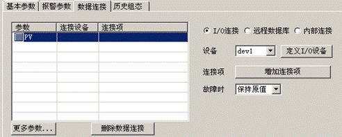 數據庫點組態: 首先,打開開發系統的數據庫選項卡,雙擊“點組態”項進入數據庫配置界面。 然后,通過在左側的導航欄目的數據庫節點上面右鍵,或者在右側的數據庫列表中雙擊打,建立一個模擬I/O點。 接著,在改點的“數據連接”參數頁中選擇I/O連接,并選擇相應的設備。 之后,選擇點的PV參數,點擊“增加連接項”按鈕: