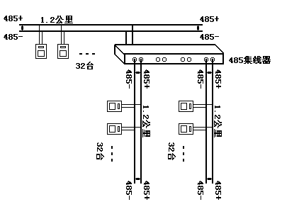 利用485中繼器或485集線器,可以將一個大型485網絡分隔成若干個網段。485中繼器或485集線器就如同485網段之間連接的"橋梁"。當然每個網段還是遵循上面的485規范,即1.2公里長度,32個節點數。