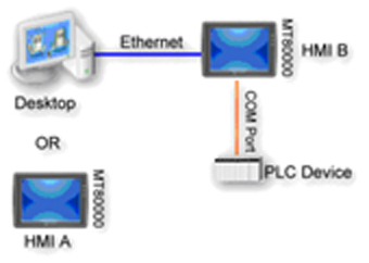 以太網絡連接的方式有兩種;可以使用RJ45平行網絡線(straight through cable),搭配集線器(hub)使用;另一種是使用RJ45跳接網絡線(crossover cable),不需使用集線器,但只限使用在一對一聯機的情況下(HMI對HMI,或PC對HMI)。