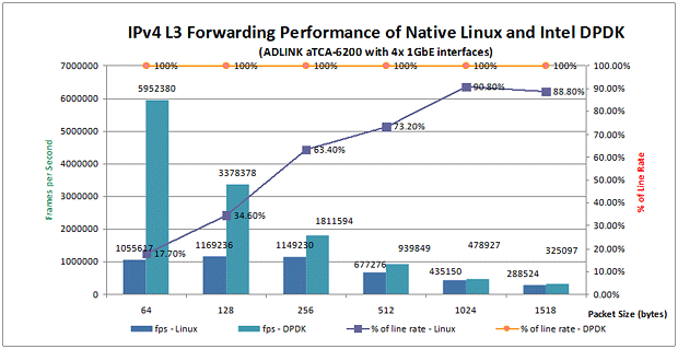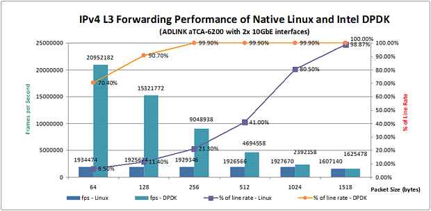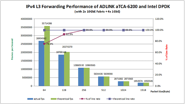 此外,Intel® DPDK還提供了一種方法,即可以設(shè)置每個執(zhí)行單元運行在每一個核心上,以維持更多的Core Affinity,從而避免緩存丟失。在此白皮書描述的測試中,aTCA-6200處理器刀片的物理端口根據(jù)Affinity被綁定在兩個不同的CPU線程上。