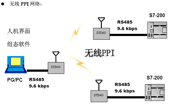 本方案是組態(tài)軟件與兩臺西門子S7-200進行無線PPI通信的實現(xiàn)方法。此方案可以作為西門子S7-200與組態(tài)軟件的無線PPI通信案例。在本方案中采用了專門用于無線PPI通信的智能數(shù)據(jù)終端DTD433M系列產(chǎn)品。