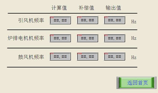 2.5“輸入輸出補(bǔ)償畫面”:可以查看鍋爐在自動運行狀態(tài)下鍋爐出水問題、回水溫度以及三個電機(jī)的頻率的計算值、補(bǔ)償值、輸出值。