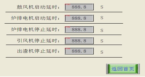 2.7“啟停延時畫面”:設(shè)定鼓風(fēng)機(jī)、爐排電機(jī)、引風(fēng)機(jī)、出渣機(jī)的啟動與停止的時間。
