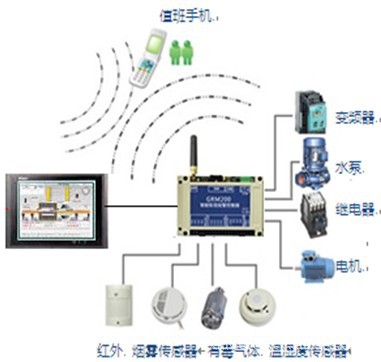GRM200本身自帶4路數字輸入,4路數字輸出,及4路模擬量,可以和維控觸摸屏配合,作為PLC使用,組成一個完整的控制系統,可通過屏或者手機短信控制各種輸出,查看報警。
