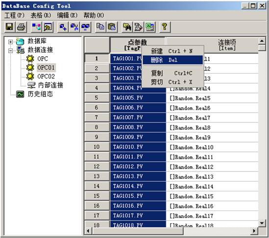 b. 清除分解設(shè)備上的數(shù)據(jù)連接項(xiàng)。在完成連接項(xiàng)備份后,在點(diǎn)組態(tài)的導(dǎo)航樹(shù)中找“數(shù)據(jù)連接”,再在它的下面找要分解出去的設(shè)備(可以保留一個(gè)設(shè)備在原有的驅(qū)動(dòng)上),選擇這個(gè)設(shè)備;在右側(cè)列中會(huì)出現(xiàn)與這個(gè)設(shè)備相關(guān)的連接項(xiàng),點(diǎn)擊“點(diǎn)參數(shù)”列表頭,選擇所有點(diǎn)參數(shù);單擊鼠標(biāo)右鍵,在彈出菜單中選擇“刪除”,這樣即可清除與此設(shè)備相關(guān)的數(shù)據(jù)連接項(xiàng)。