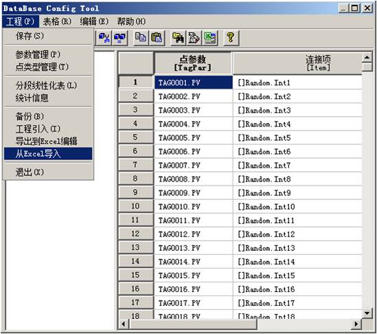 通過(guò)開(kāi)發(fā)環(huán)境進(jìn)入點(diǎn)組態(tài),在點(diǎn)組態(tài)窗口菜單上選擇“工程”,再選擇“從Excel導(dǎo)入”。如下所示: