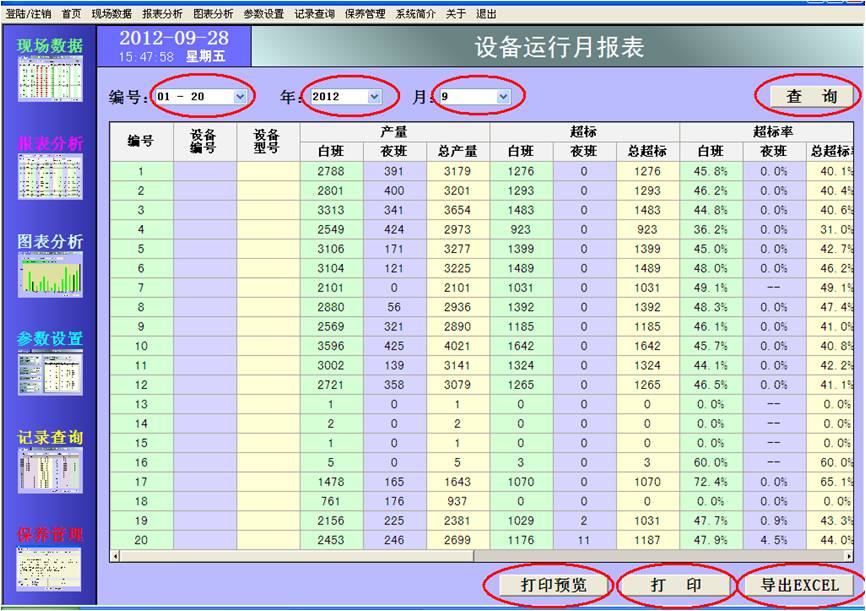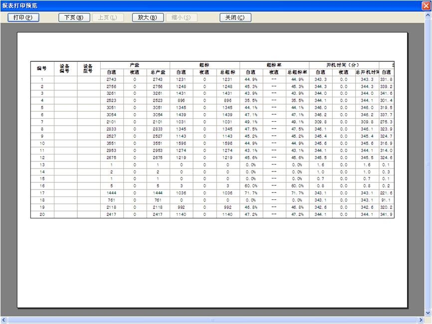 監(jiān)控系統(tǒng)可以為生產(chǎn)全過(guò)程的數(shù)據(jù)產(chǎn)生日?qǐng)?bào)表和月報(bào)表,按設(shè)備和班次統(tǒng)計(jì)產(chǎn)量、超標(biāo)、超標(biāo)率、開機(jī)時(shí)間、運(yùn)行時(shí)間、開機(jī)率和運(yùn)行率。
