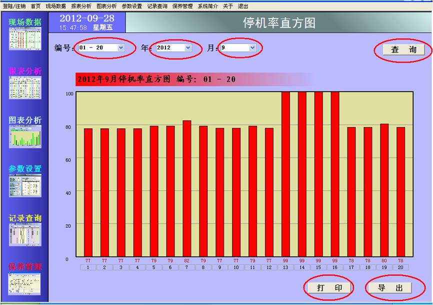 停機(jī)率直方圖通過(guò)選擇編號(hào)、年、月,然后點(diǎn)擊“查詢”按鈕進(jìn)行查詢,按編號(hào)統(tǒng)計(jì)的設(shè)備停機(jī)率直方圖即顯示在下方: