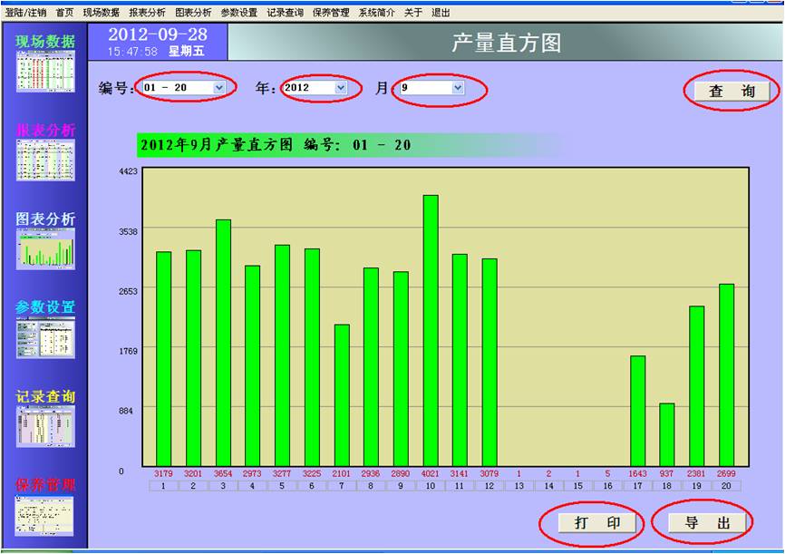 產(chǎn)量直方圖通過(guò)選擇編號(hào)、年、月,然后點(diǎn)擊“查詢”按鈕進(jìn)行查詢,按編號(hào)統(tǒng)計(jì)的設(shè)備產(chǎn)量直方圖即顯示在下方: