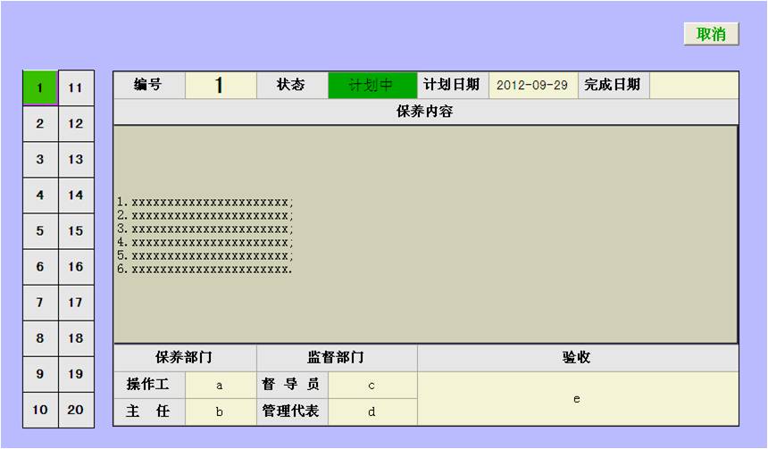 保養(yǎng)管理是用來(lái)查看和制定設(shè)備保養(yǎng)計(jì)劃的。制定保養(yǎng)計(jì)劃之后,當(dāng)保養(yǎng)日期到來(lái),即提醒用戶。