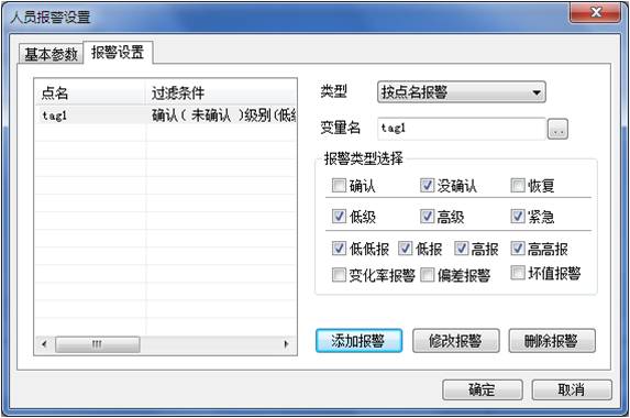 2. 短信報(bào)警點(diǎn)設(shè)置:在點(diǎn)組態(tài)中新建短信報(bào)警點(diǎn),配置相關(guān)人的手機(jī)號(hào)碼及關(guān)注的報(bào)警情況,比如: