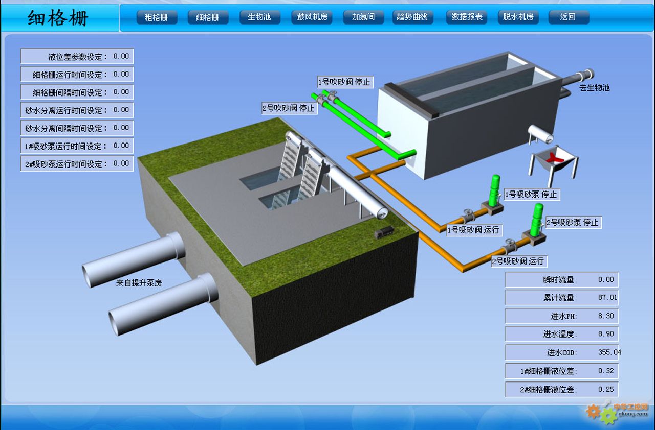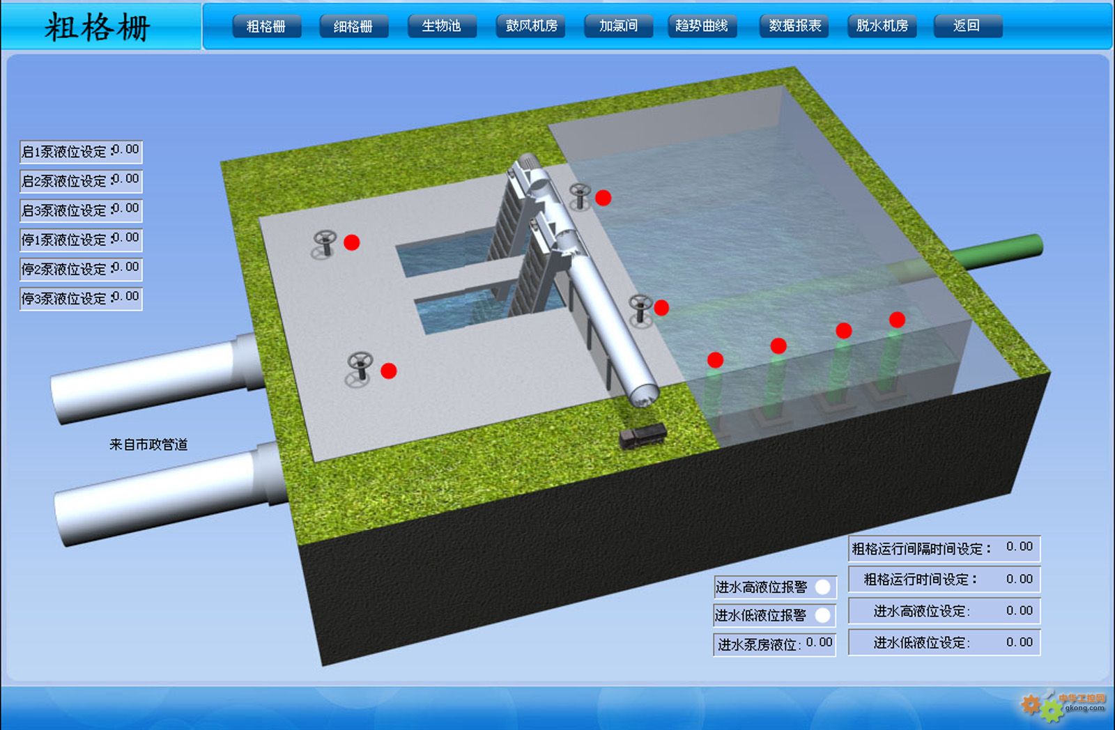 細格柵的間距比粗格柵小,為4mm,主要作用是進一步攔截污水中的污物。需要檢測格柵水位差、流量、泵狀態(tài)等參數(shù)。