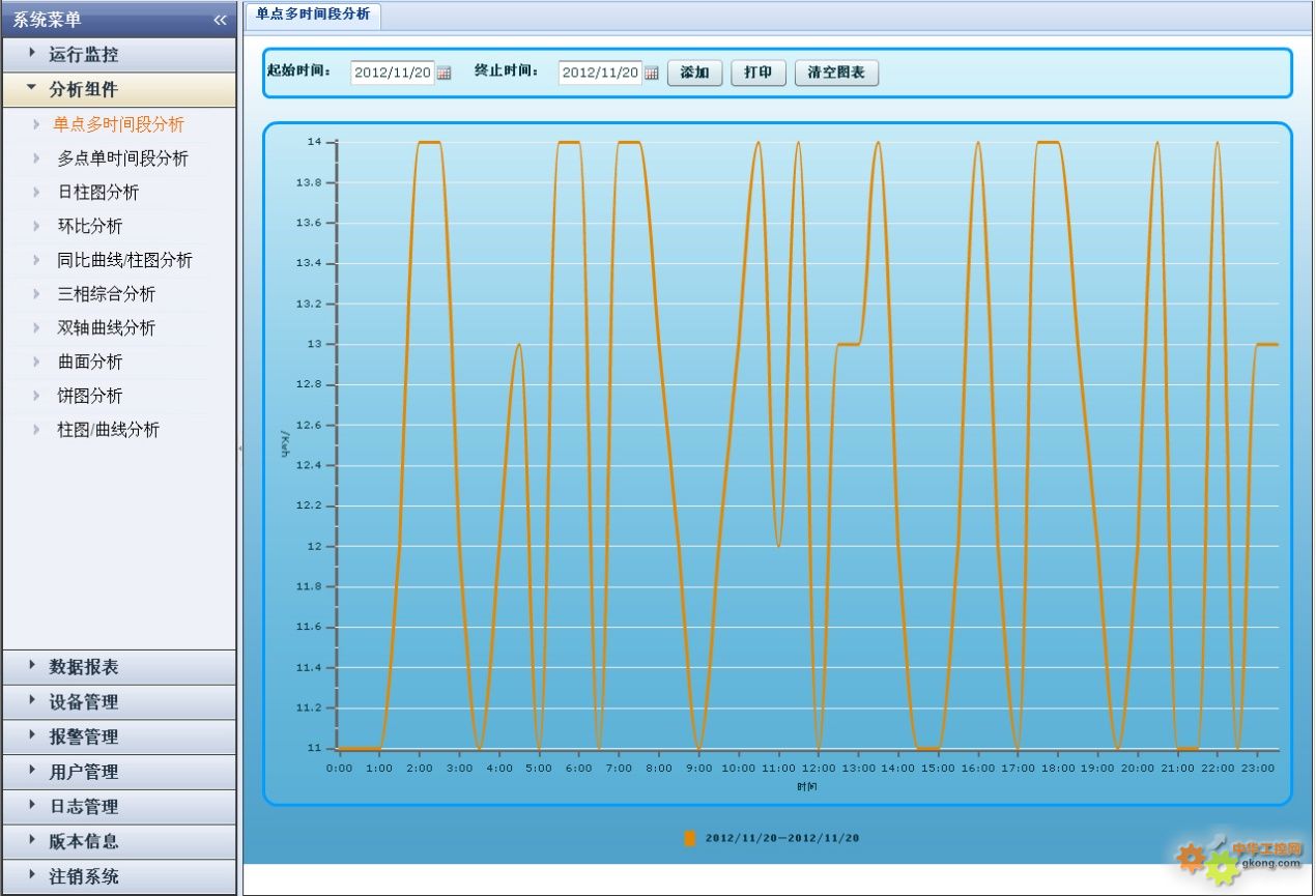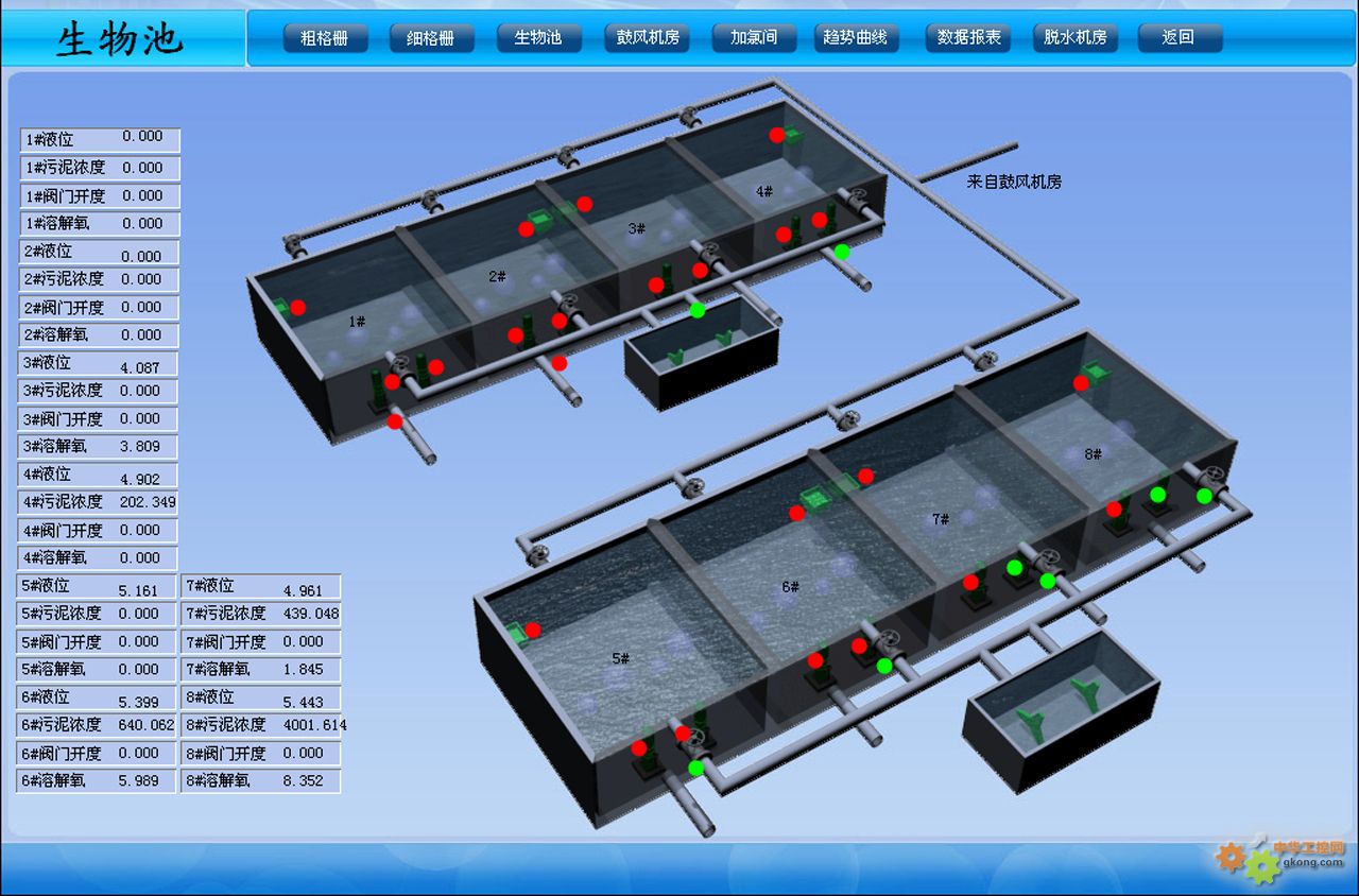 系統(tǒng)以美觀、友好的界面顯示設(shè)備運行狀態(tài)、流量、水位、COD、超聲波液位計、溶解氧計、氧化還原電位計、污泥濃度計、電磁流量計、等數(shù)據(jù),并以仿真圖、直方圖和曲線圖、棒圖等多種方式清晰直觀的顯示各個敏感數(shù)據(jù),方便用戶對各敏感數(shù)據(jù)進行歷史查詢和對比分析。