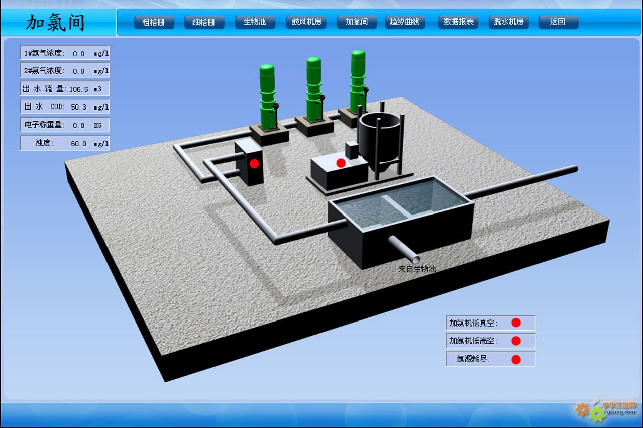 污水出廠前采用液氯消毒,經(jīng)接觸池后出水由管道排向大海。需要監(jiān)測加氯機狀態(tài)、氯氣濃度、氧氣濃度、出水流量、出水cod、電子秤重量、濁度等參數(shù)。