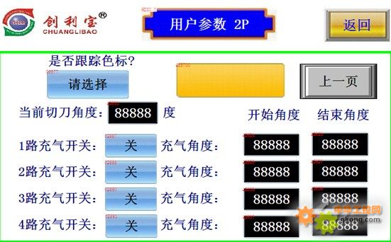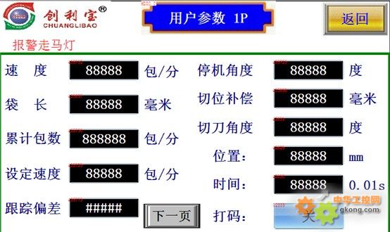 2.3“用戶參數”:對包裝機速度、袋長、累計包數、停機角度、切刀角度等等參數的設置。