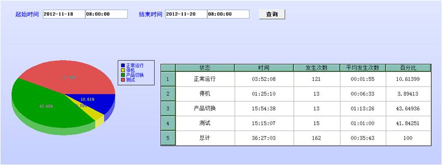 生產狀態報表:能夠查詢某一時間范圍內的各種狀態發生的起始時間,并按狀態類型給出全局對比,給出某一狀態在該時間段內發送的總時間、發送的次數、平均發生時間和時間的百分比對比。
