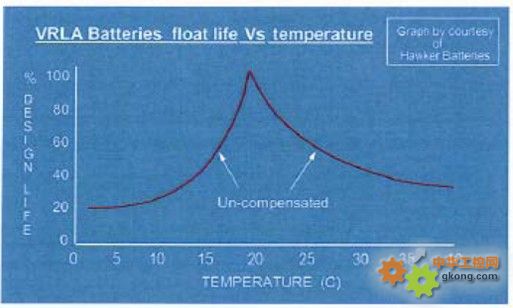 當環境溫度升高時,蓄電池所允許的浮充電壓的閥值將逐漸下降。如果浮充電壓閥值仍為固定值電壓,(12V蓄電池為13.5V),勢必會將蓄電池組置于“過電壓充電”工作狀態,顯然會使蓄電池加速老化。溫度升高時,應降低充電電壓,否則蓄電池中極板受硫酸腐蝕加劇,從而使其壽命縮短。當環境溫度低于25℃時,充電電壓應提高,以防止充電不足。