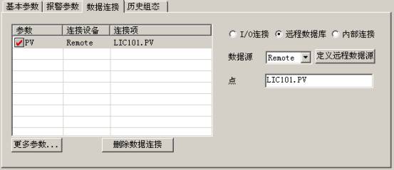 數(shù)據(jù)源就是要連接的遠(yuǎn)程的數(shù)據(jù)服務(wù)器,點是遠(yuǎn)程數(shù)據(jù)庫的點參數(shù)。這樣連接完成之后,當(dāng)前選中的點參數(shù)(如LIC110.PV)就與遠(yuǎn)程數(shù)據(jù)庫的指定點參數(shù)相對應(yīng)了。這時在本地數(shù)據(jù)庫中就可以使用該點參數(shù)(LIC110.PV)進(jìn)行控制、運(yùn)算,它等同于遠(yuǎn)程數(shù)據(jù)庫的LIC101.PV。