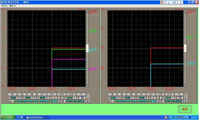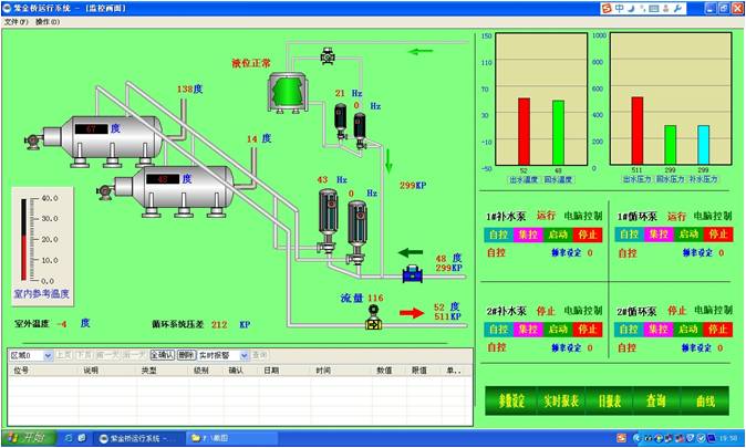 這些設備由一臺操作站來監控。軟化水箱的超高和 超低水位、系統超溫超壓信號在操作臺產生報警信息。操作人員通過監控畫面很方便地了解設備運行狀態,并可通過該畫面手動控制調節設備的運行。重要的參數可切換到曲線窗口,便于觀察分析。