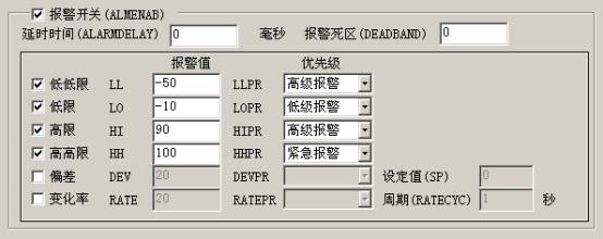對過程變量的測量值設置一系列的限值,當測量值越過限值時,就會產生限值報警。限值共有4種,即低低限、低限、高限、高高限,注意它們都必須在測量值的量程范圍內,并且它們的數值必須依次增大。當測量值越限時,并不是針對于每一個限值都產生一個報警,而是僅產生最近越限的報警。比如當測量值越過高高限時,并不是會產生高限和高高限兩個報警,而是僅產生一個高高限報警。