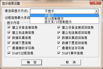 顯示方式設(shè)置為16進(jìn)制顯示或按文本/16進(jìn)制顯示,具體選擇哪一個(gè),視驅(qū)動(dòng)通訊協(xié)議而定,如果設(shè)備驅(qū)動(dòng)協(xié)議是ASCII碼,建議選擇按文本/16進(jìn)制顯示;如果設(shè)備通訊協(xié)議是二進(jìn)制方式,建議選擇16進(jìn)制顯示。 選擇顯示方式,點(diǎn)擊確定按鈕,完成顯示設(shè)置。