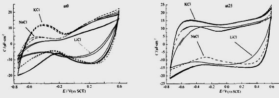 半徑小的電解液離子更易于向孔內遷移,擴散雙電層的結構特征不明顯,雙電層電容得以提高.然而,水相體系中,離子大多以水化的形式存在,因此,水化離子大小決定了形成雙電層的離子有效半徑.離子的水化主要取決于離子的大小及與H_20分子間作用力的強弱.離子越小,與H 0分子間作用力越強,離子水化越趨嚴重.圖4為樣品at0和中孔炭at25在0.2 mol·L的LiC1、NaC1和KC1電解液中測得的CV曲線.可以看出,樣品at0的孔徑與離子大小接近,對離子的尺寸更為敏感,“分子篩”的作用表現明顯.在陽離子進行吸脫附的負極極化區,CV曲線表現出較大的差別.由于水合離子的大小順序為Li >Na >K ,負極極化區的電容以在KC1溶液中所測最高,并與正極極化區的電容相近,CV曲線最為對稱,說明cl一與 由于離子大小及與H20分子間的作用力近似,因此具有相同的水化機制和水化程度.而表現cl一吸脫附的正極極化區,在NaC1和KC1溶液中所測的CV曲線基本重合;在LiC1溶液中,充、放電容量有所減小,這可能是由于Li 的離子半徑過小,水化作用非常強,Li 水化離子對水化陰離子Cl一在炭電極表面的吸附也造成了一定影響,使正極極化區的充放電容量降低.中孔炭at25的孔徑大,水化離子進出的阻力大為降低,負極極化區充、放電容量的差別縮小,離子水化對雙電層電容的影響顯著減弱,但仍以KC1溶液中所測電容最高;且與樣品atO相比,稀溶液中,在PZC點雙電層的擴散減弱,微分比電容曲線的凹點已表現不明顯.