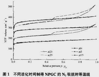 由圖2(b)質量微分比電容曲線可看出,炭化樣品at0雖然孔表面利用率高,但比表面最低,其質量比電容也最小.經CO2活化后,樣品at5的質量比電容隨比表面增大而迅速提高;隨著活化時間的延長,微孔炭at15由于孔表面利用率低,其質量比電容只略有增加;而中孔炭at25、at35的比表面雖低于at15,但孔表面利用率高,質量比電容繼續隨活化時間的延長而增大.但是,Salitra等 研究微孔活性炭布孔與離子的關系,認為活化時間最短的樣品孔徑與離子大小相近,彼此交互作用強,具有最高的孔表面比電容,性能最優.然而,上述研究表明,多孔炭電極的面積微分比電容僅表明孔表面利用率的高低,比容量還取決其比表面積的大小.