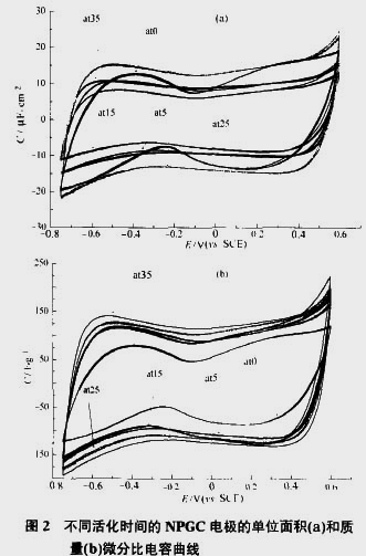 圖3 不同活化時間的NPGC電極的單位面積(a)和質量(b)微分比電容曲線