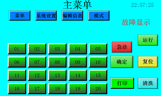 主菜單可以進入系統設置,編輯信息等畫面。該畫面主要用于選擇看病人數和一些運行,清洗等具體功能。