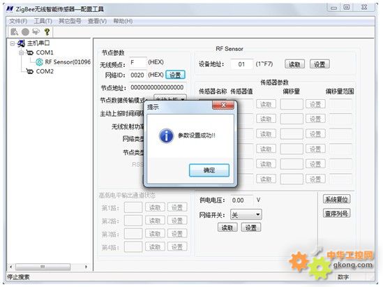 E、設備地址:1~F7 可設,可通過設備地址來區分數據來源與節點地址功能類似。設置完成后單擊后面的“設置”按鈕,返回提示對話框,如圖6-8 所示,參數設置成功!!,單擊“確定”按鈕;