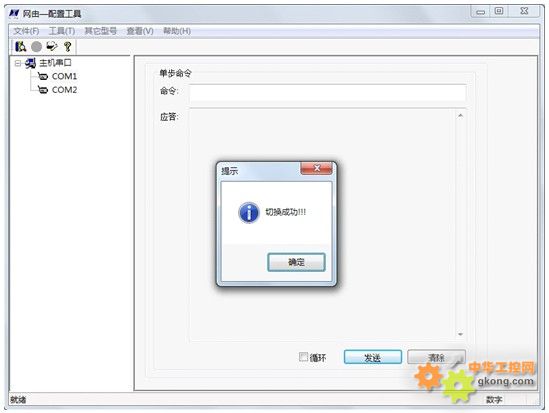 6、對于JZH-XXX-12 系列產品請接通外部電源,對于JZH-XXX-D 系列產品請用磁鋼在復位感應區滑動復位,軟件提示“切換成功!!!”如圖6-5 所示;(一閃就過,不用單擊確定)