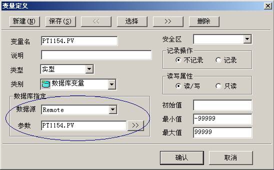 提示:如果有兩個(gè)數(shù)據(jù)庫(kù)的變量同名,如上例中在本地?cái)?shù)據(jù)庫(kù)中已經(jīng)存在一個(gè)變量PT1154.PV,而且需要同時(shí)訪問(wèn)這兩個(gè)變量,則在定義變量時(shí),把其中的任何一個(gè)定義為其它名稱,如把Remote的PT1154.PV定義為RPT1154.PV即可。