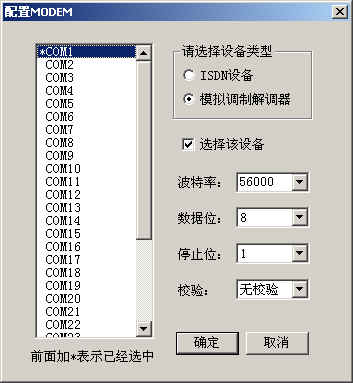 需要指定串口的通訊參數(shù),注意與服務(wù)器端保持一致。設(shè)備類型是ISDN還是模擬調(diào)制解調(diào)器取決于實際選用的設(shè)備。如果是ISDN設(shè)備,還需要電信運營商提供相應(yīng)的服務(wù)。 對服務(wù)器端進行配置,在提供服務(wù)的計算機上,啟動TelServer.exe,選擇菜單"文件/配置Modem",進入到Modem配置:
