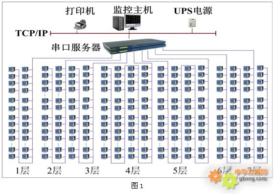 為滿(mǎn)足樓層和配電室統(tǒng)一監(jiān)控的要求,現(xiàn)場(chǎng)所有儀表通過(guò)屏蔽雙絞線連接至串口服務(wù)器,進(jìn)而實(shí)現(xiàn)對(duì)現(xiàn)場(chǎng)數(shù)據(jù)的采集,存儲(chǔ),處理,實(shí)時(shí)顯示以及歷史查詢(xún),拓?fù)浣Y(jié)構(gòu)如圖1: