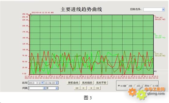 4.2. 趨勢(shì)曲線:實(shí)現(xiàn)了用戶(hù)所要求的通過(guò)對(duì)各配電回路的電壓、電流或功率繪制趨勢(shì)曲線,分析該回路配電運(yùn)行工況,如圖3: