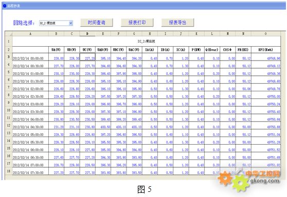 4.4報(bào)表功能:通過(guò)報(bào)表功能可以查詢(xún)?nèi)我鈺r(shí)刻回路的全常規(guī)電參量數(shù)據(jù)、回路的用電量,如圖5: