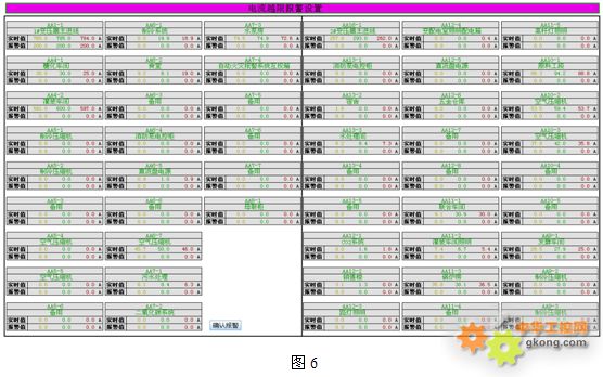 4.5 電流越限報(bào)警設(shè)置:電力監(jiān)控系統(tǒng)定義了電流越限報(bào)警設(shè)置界面,用戶(hù)根據(jù)各個(gè)回路現(xiàn)場(chǎng)線纜的橫截面(粗細(xì))決定設(shè)定電流預(yù)警值,避免電流過(guò)大造成用電事故發(fā)生。如下圖6所示: