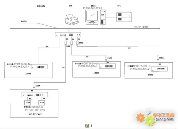 對藍(lán)礬化工管理方提出的需求和我們確定的組網(wǎng)方案,站控管理層設(shè)備層采購DELL主機,三星19寸顯示器,SANTAK的UPS;網(wǎng)絡(luò)通訊層使用MOXA的NPORT5630-8串口服務(wù)器和MS1102的光電轉(zhuǎn)換器以及3C16470的網(wǎng)絡(luò)交換機;現(xiàn)場設(shè)備層采用上海安科瑞公司PZ96-E4系列網(wǎng)絡(luò)電力儀表,總線鋪設(shè)屏蔽雙絞線,以滿足系統(tǒng)組網(wǎng)的要求。