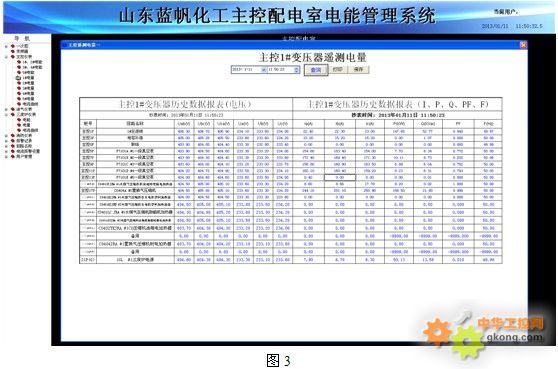 5.2. 遠(yuǎn)程抄表查詢:各個配電室各個回路按照時間段進(jìn)行歷史數(shù)據(jù)查詢。選擇回路后,可選擇時間間隔、時間長度對該回路進(jìn)行歷史數(shù)據(jù)精確查詢,包括電壓、電流、功率、功率因數(shù)和電能等常用數(shù)據(jù)。查詢結(jié)果可導(dǎo)出成EXCEL表格進(jìn)行保存,也可打印保存,如圖3