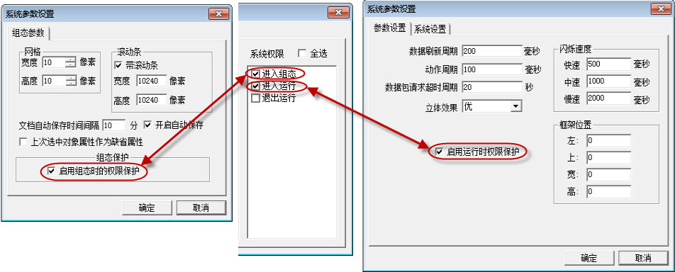系統權限中進入組態和進入運行的設置,還應注意勾選上系統配置中開發系統參數的“啟用組態時的權限保護”和運行系統參數中的“啟用運行時的權限保護”。這樣在進入組態和進入運行時,只有輸入正確的用戶名密碼才可進入。