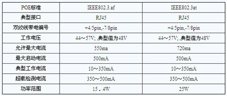 POE的技術(shù)標(biāo)準(zhǔn)集中體現(xiàn)在IEEE802.3.af和IEEE802.3at。IEEE802.3af標(biāo)準(zhǔn)是2003年6月由思科公司主導(dǎo)修訂并由以太網(wǎng)供電委員會(huì)發(fā)布的《IEEE802.3af標(biāo)準(zhǔn)載波監(jiān)聽(tīng)多路訪問(wèn)/沖突檢測(cè)(CSMA/CD)介質(zhì)訪問(wèn)控制協(xié)議和物理層規(guī)范》(修正版本《通過(guò)介質(zhì)相關(guān)界面(MDI)供電給受電終端設(shè)備DTE》)。在市場(chǎng)應(yīng)用過(guò)程中,出現(xiàn)了功率更高的IEEE802.3at標(biāo)準(zhǔn),表一是兩種標(biāo)準(zhǔn)的參數(shù)。