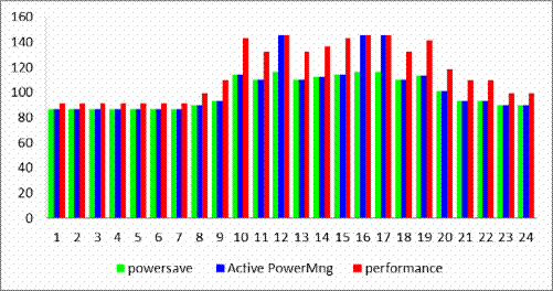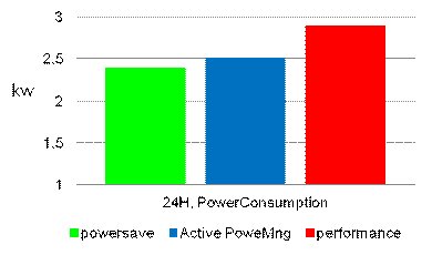 通過策略的配置,將ATCA刀片上CPU的工作模式切換至節(jié)能或主動電源管理模式后,每個刀片的功耗相比持續(xù)運行在性能模式下減少15%(參見圖4和圖5)。每片板卡在加載服務(wù)的情況下可以節(jié)約0.4KW的功耗(參見圖5)。如果一個14槽的ATCA機框中使用了10個刀片,那每天節(jié)約的功耗大約4KW。