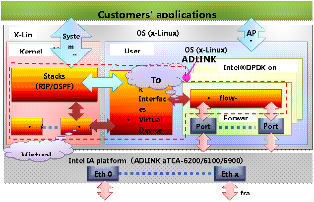 DPDK(Data Plane Development Kit,數(shù)據(jù)平面開發(fā)套件)是一個專為x86架構(gòu)處理器提供的輕量級運行環(huán)境。它提供了低功耗和Run-to-Completion(RTC,運行到完成)模式,以此最大限度的提升數(shù)據(jù)包的處理性能。而且DPDK還包含了優(yōu)化的和高效的函數(shù)庫,為用戶提供豐富的選擇,例如我們熟知的環(huán)境抽象層(EAL,Environment Abstraction Layer),它負責控制低級資源并提供優(yōu)化的輪詢模式驅(qū)動(PMD,Poll Mode Driver),以及更高級別應(yīng)用的完整API接口,圖7為軟件層級結(jié)構(gòu)圖。
