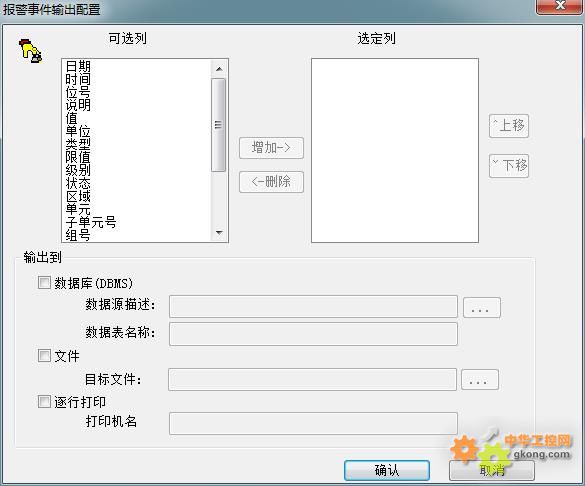 用戶首先需要選擇要輸出哪些項,可以輸出的項很多,包括日期、時間、位號、說明、值等,用戶可以根據需要將左側列表框中的項逐一增加到右側。右側選定列中為空,則不會輸出任何信息.