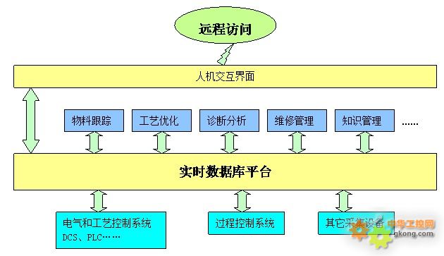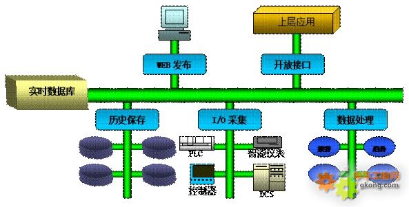 在本系統(tǒng)中,實時數(shù)據庫的主要功能是發(fā)揮其作為一種高效、穩(wěn)健的信息橋梁的作用,為設備診斷和在線工藝優(yōu)化等上層應用程序和底層控制設備之間鋪設一條快速、及時、準確地雙向數(shù)據通路,提供一個完整、穩(wěn)定、開放性好的數(shù)據支持平臺。