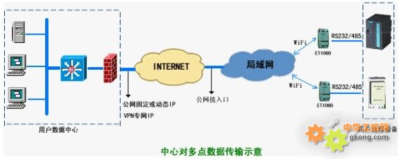 數(shù)據中心服務器需具備外網固定IP、域名或拔號上網的其中一種條件。通過固定IP建立VPN企業(yè)虛擬局域網;撥號上網,通過域名管理軟件完成免費域名申請,通過動態(tài)域名的方式完成數(shù)據的無線傳輸。在服務器上形成對應的HMI人機界面,完成數(shù)據的實時監(jiān)測和控制。